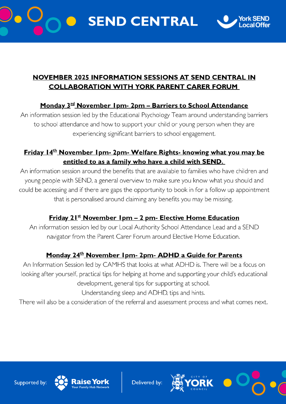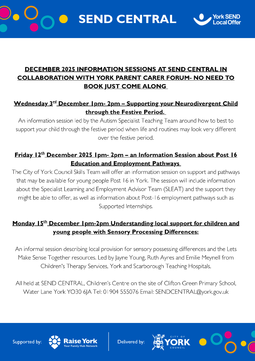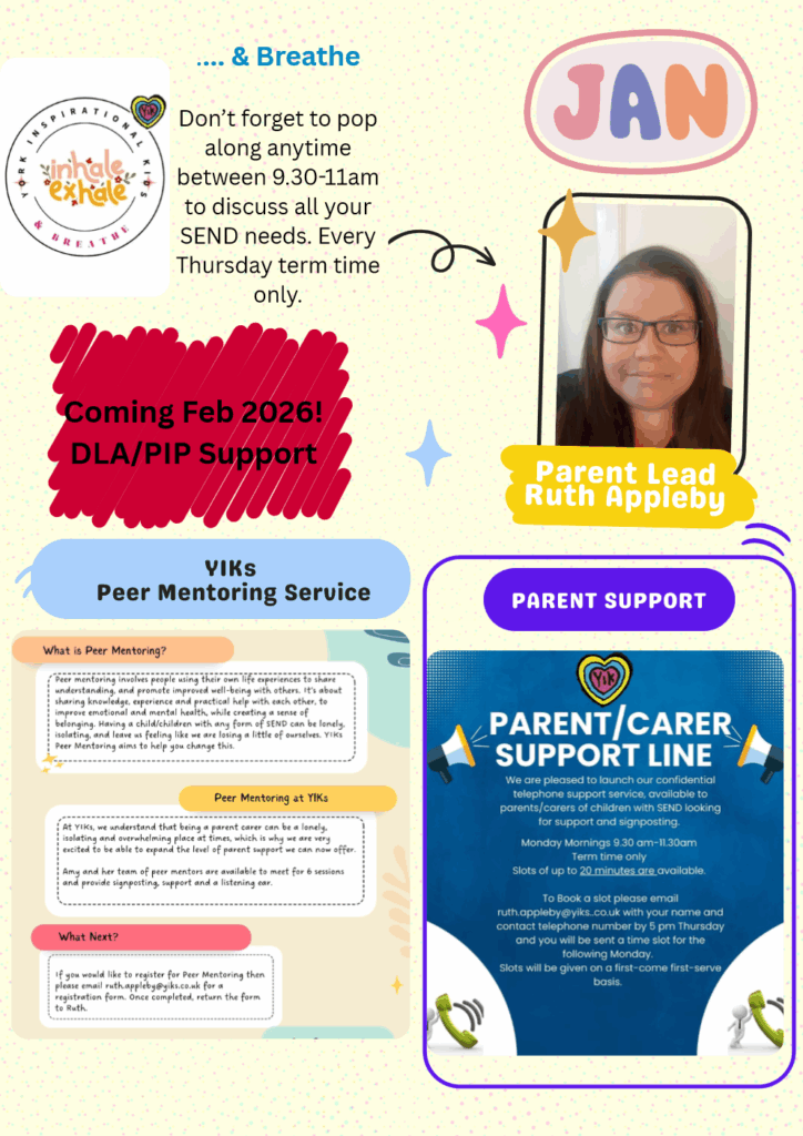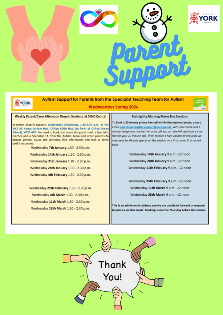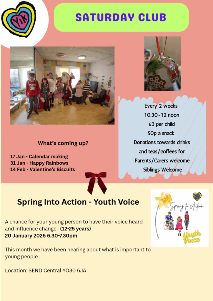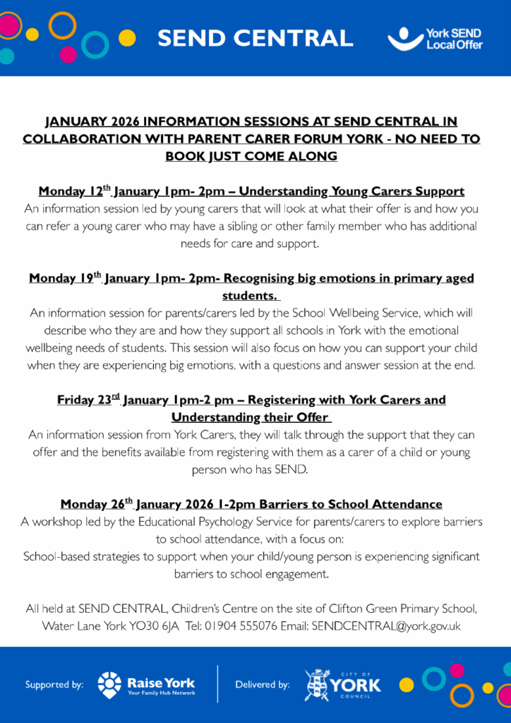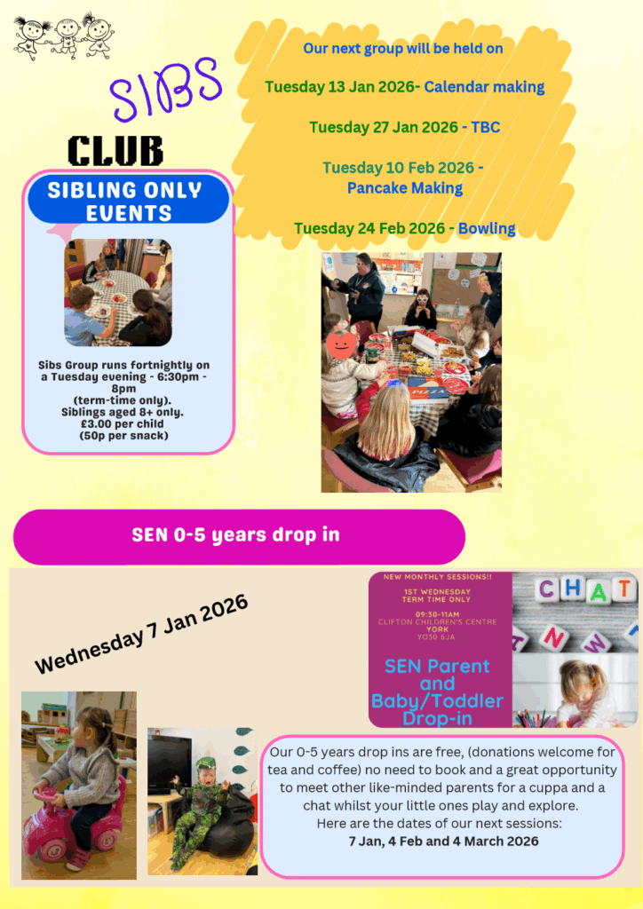 Drop into the hub at Clifton Children’s Centre for help and support with any SEND queries or visit https://www.yorksend.org/ to see a full timetable of events and activities.