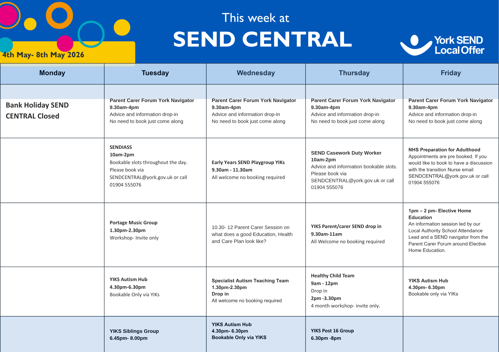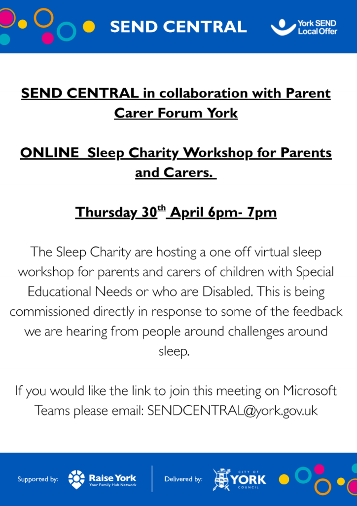 SEND CENTRAL is York’s Family Hub that specialises in Special Educational Needs and Disabilities (SEND) where families can seek advice and information about what’s available in York when they have children and young people who have additional needs, any age from 0 to 25. You can find out more about SEND Central on the York Local Offer website.
