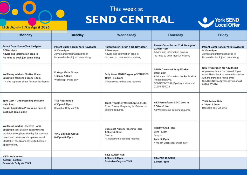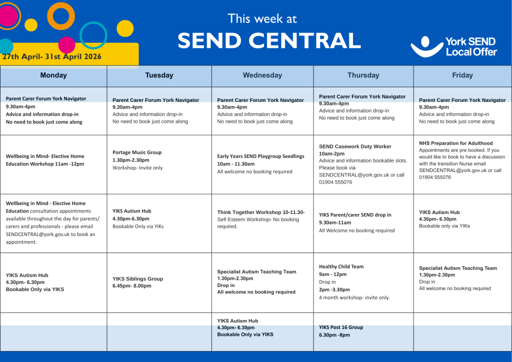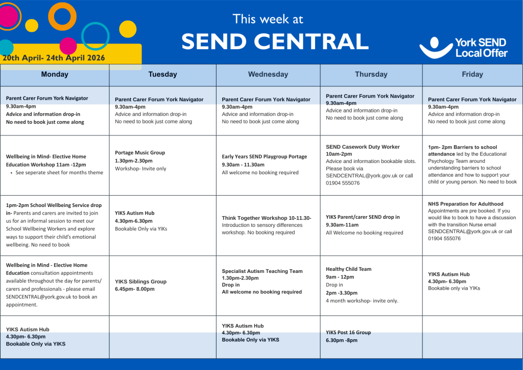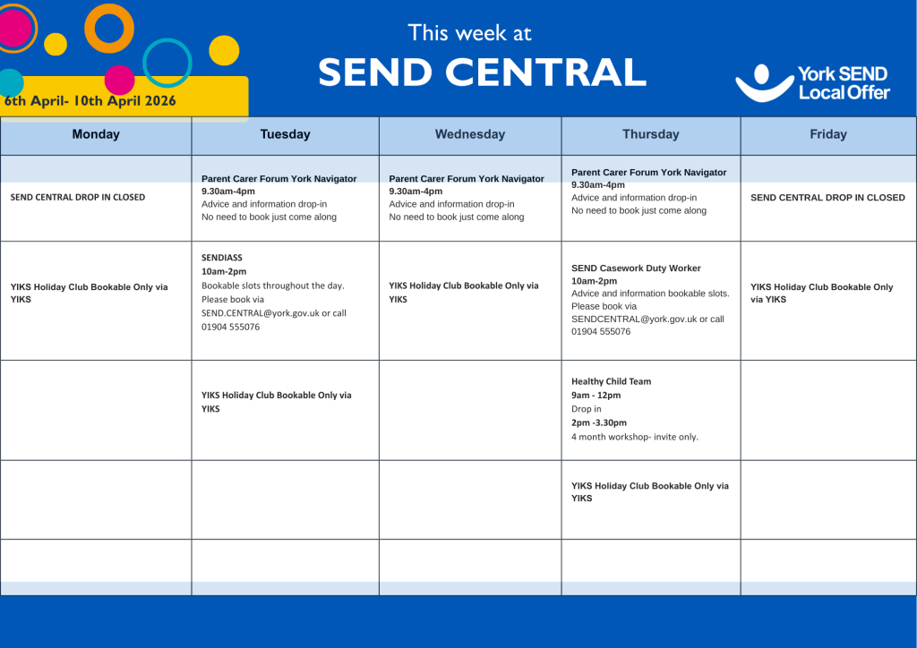 **Please Note Over the 2 week Easter Holiday period on Monday’s and Fridays the regular reception drop in will be closed**York SEND Central Team